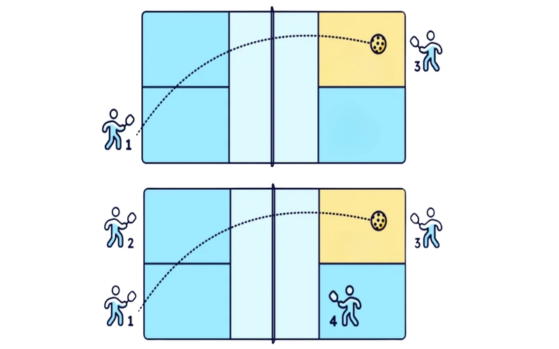 Bóng phải đi chéo sang ô đối diện. Nếu bóng không qua lưới hoặc ra ngoài khu vực hợp lệ, lượt giao bóng sẽ mất.
